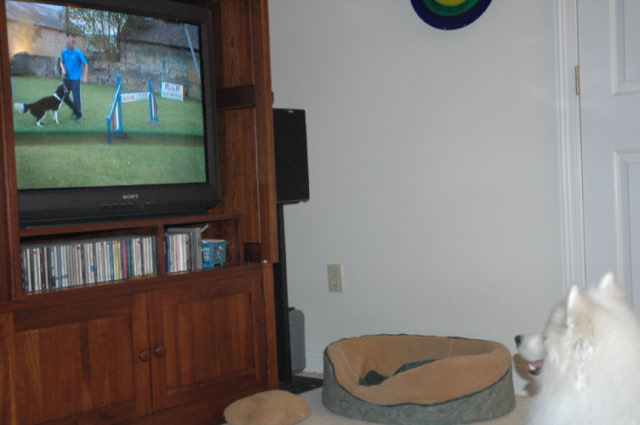 Concentrating hard on the agility training DVD... so Dad doesn't have to learn too...